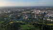 4K Aerial view Real time Footage of Munich Olympic Park or Olympiapark which was constructed for the 1972 Summer Olympics. Located in the Oberwiesenfeld neighborhood of Munich, Germany, sport complex, Tourism and Travel Destination.