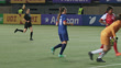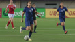International women's football match featuring a counter attack surging forward with the star #10 center midfielder as the focus sprinting downfield. An artful no-look pass is made to the striker whose shot attempt is blocked by the goalkeeper with a kick save