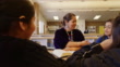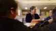 An Indigenous Navajo high school teacher with a group of students in a school library.