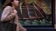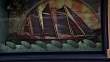 MEDIUM ANGLE OF LARGE SHIP IN DISPLAY WINDOW IN FRONT OF STORE. SEE SHIP MOVE UP AND DOWN AS IF SAILING THROUGH WATER. SEE PEDESTRIANS WALK IN FRONT OF DISPLAY IN FOREGROUND.