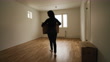 A woman in her new, empty apartment. Spending time in her new home.