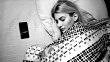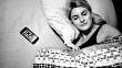 Young,beautiful woman is waking up in bed,turning off her phone alarm and stretching. Black and white