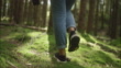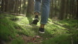 Woman hiking through a nordic forest in Sweden. Close up of her legs walking through the moss in the forest.