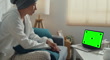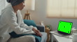 Young Asian woman sick with cancer using laptop talk to doctor sitting on sofa in living room at home. Chroma key technology mock-up green screen, Marketing design concept.