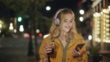 PAN CU Young woman using her phone walking in the city at night - 4K stock video